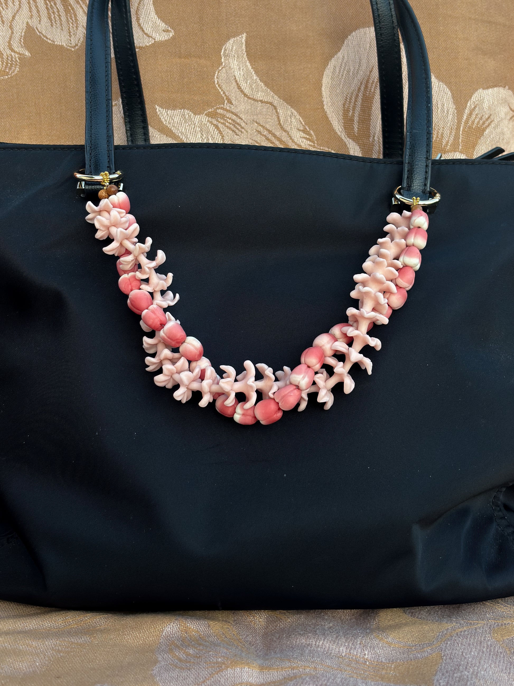 Red wort berries and pink hyacinth twisted double lei - All flower beads are handmade, meant to be similar to life-size, with 4mm~ scandal wood beads.